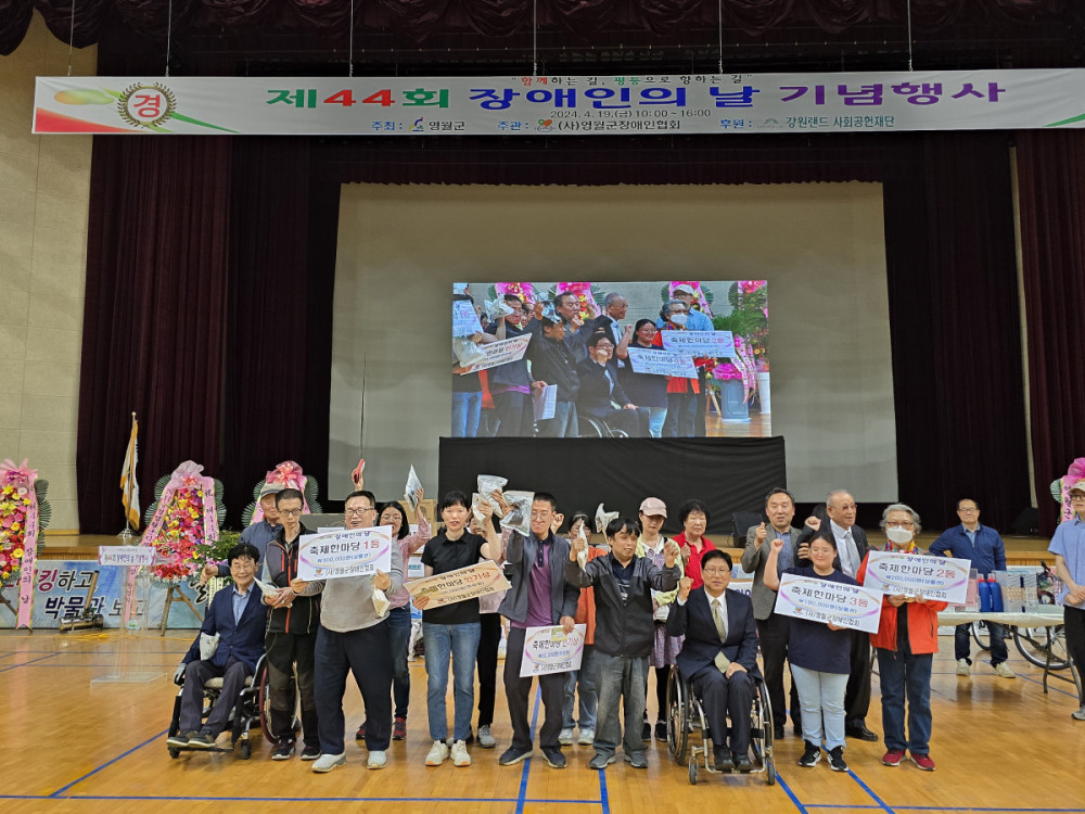 제44회 장애인의 날 기념행사 최고관리자 0 4월 19일 영월군 관내 장애인과 비장애인, 시설종사자, 자원봉사자 포함한 700여명 참여하면서 제44회 장애인의 날 기념행사가 열렸다.1부 행사는 식전 축하공연, 장애인 복지증진 유공자 포상, 장학금 전달 진행 끝난 후 중식제공하였으며, 2부 행사는 노래자랑 및 장기자랑, 행운권 추첨을 진행하였다.이번 행사는 장애인 인식개선 및 장애인 서로간의 친목을 도모하기 위해 화합의 장으로 마련하였다.